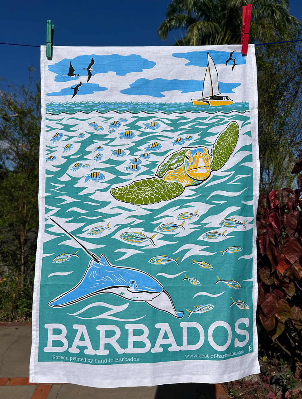 Hand screen printed in Barbados with an Olivia Pile design inspired by the catamaran cruises everyone enjoys. 100% cotton. Sewn by cottage workers.